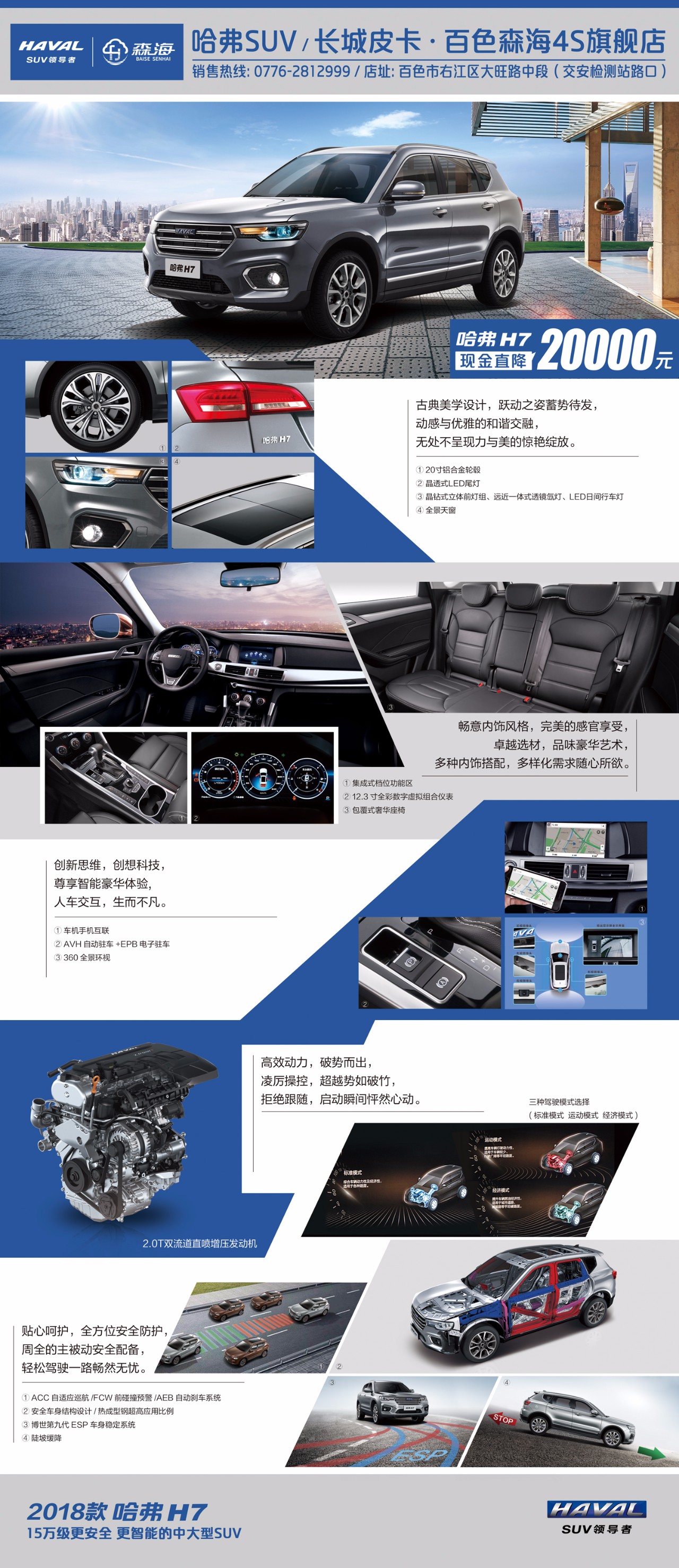 煥新外觀造型彰顯威猛霸氣 2018款哈弗H7在外觀上增加了更多的剛猛元素,新車在前杠、前后組合燈、翼子板,后背門等多個(gè)部位采用了全新造型,散發(fā)著濃郁荷爾蒙氣質(zhì),在彰顯運(yùn)動(dòng)氣質(zhì)的同時(shí),外觀更富張力,很好地增強(qiáng)了外觀的視覺沖擊力,引領(lǐng)了設(shè)計(jì)潮流。 2018款車型的內(nèi)飾更具豪華范。中控臺(tái)采用多層次立體設(shè)計(jì)風(fēng)格,真皮、拉絲金屬與搪塑多種不同質(zhì)感材質(zhì)的組合將內(nèi)飾的豪華質(zhì)感烘托而出。此外,新車還將中控,方向盤,肘枕,車門扶手等位置更改為細(xì)皮紋,很好地增加了細(xì)膩感。同時(shí),用戶經(jīng)常接觸的部位,如肘托,均使用了觸感細(xì)膩柔軟的PU或真皮材質(zhì),使整車內(nèi)飾更具品質(zhì)感。 極致安全保障一路暢行無(wú)憂 作為哈弗SUV安全技術(shù)的集大成者,2018款哈弗H7在安全配置層面上的全面武裝直逼豪華車水準(zhǔn)。新車配備了ACC自適應(yīng)巡航、FCW前預(yù)碰撞系統(tǒng)、AEB自動(dòng)剎車系統(tǒng),并且全系標(biāo)配360全景環(huán)視、疲勞駕駛監(jiān)測(cè)系統(tǒng)等諸多高科技安全配置。 2018款哈弗H7全車采用高剛性安全結(jié)構(gòu)車身,并大量采用高強(qiáng)度鋼及熱成型鋼,為駕乘人員提供更安全的駕乘環(huán)境。此外,還采用了全框式前副車架,在提升車身整體的剛性、穩(wěn)定性和抓地力的同時(shí),還能有效過(guò)濾顛簸,讓用戶的駕乘安心更舒心。18款哈弗H7將被動(dòng)安全技術(shù)與主動(dòng)安全技術(shù)完美融合,為用戶提供了高效智能的五星級(jí)安全呵護(hù)。 智能駕控體驗(yàn)勁享科技互聯(lián)樂趣 新車配備智能啟停功能,在降低發(fā)動(dòng)機(jī)怠速空轉(zhuǎn)時(shí)間的同時(shí)幫助駕駛者更加舒適自如的應(yīng)對(duì)紅綠燈等車輛啟停需求,更能有效避免發(fā)動(dòng)機(jī)空轉(zhuǎn)帶來(lái)的尾氣排放與燃油消耗。除此之外,2018款哈弗H7還擁有360環(huán)視、電子手剎(EPB)、自動(dòng)駐車、車機(jī)手機(jī)互聯(lián)(carlife)系統(tǒng)等多種智能配置,將互聯(lián)融入用車生活,不管是車流不息的城市,還是遠(yuǎn)離喧囂的鄉(xiāng)村野外,哈弗H7都能用科技為駕乘者帶來(lái)便捷、豐富多彩的智能用車體驗(yàn)。 大空間高配置臻享豪華舒適駕乘 新車全系標(biāo)配超大全景天窗,讓藍(lán)天美景一覽無(wú)余。主銷車型更是標(biāo)配12.3寸全彩虛擬組合儀表,配置奢華,堪比豪華品牌。為乘客量身打造的柔軟舒適、質(zhì)感細(xì)膩的座椅極富包裹性和支撐性。哈弗H7采用高規(guī)格的內(nèi)飾設(shè)計(jì),中控臺(tái)、手套箱、兩側(cè)門板都使用觸感柔軟的搪塑工藝設(shè)計(jì)。中控臺(tái)采用多層次立體設(shè)計(jì)風(fēng)格,真皮、拉絲金屬與搪塑多種不同質(zhì)感材質(zhì)的組合將內(nèi)飾的豪華質(zhì)感烘托而出。 2018款哈弗H7的車身尺寸為4715*1925*1718mm,軸距為2850mm,為消費(fèi)者提供了舒適的乘坐空間,后排可以輕松容下三個(gè)“分量十足”的成年男人。同時(shí),哈弗H7的儲(chǔ)物空間也是頗為令人滿意。后備箱最大擴(kuò)展空間可達(dá)1232L,大箱小包,即使是全家的行李都能完全HOLD住。 寬適的空間,豪華精良的配置,2018款哈弗H7給予消費(fèi)者超越期待的舒適駕乘享受,讓用戶擁有更高品質(zhì)的用車生活。 強(qiáng)勁高效動(dòng)力縱享駕馭激情 2018款哈弗H7搭載2.0T雙流道直噴渦輪增壓發(fā)動(dòng)機(jī),在可靠的雙流增壓器、燃油缸內(nèi)直噴技術(shù)和雙VVT既可變氣門升程技術(shù)的組合下,有效實(shí)現(xiàn)高效動(dòng)力輸出,最大功率170KW,最大扭矩355N•m。與之匹配的格特拉克6速濕式雙離合變速器,換擋邏輯清晰迅速。此外,哈弗H7還設(shè)有運(yùn)動(dòng)、標(biāo)準(zhǔn)、經(jīng)濟(jì)三種駕駛模式,不同的駕駛模式,帶來(lái)不一樣的精彩,讓用戶享受不一樣的生活Style。 2018款哈弗H7將憑借更安全、更智能的姿態(tài),在競(jìng)爭(zhēng)白熱化的SUV市場(chǎng)搶奪一席之地,在同級(jí)別產(chǎn)品中,以絕對(duì)的產(chǎn)品優(yōu)勢(shì)贏得用戶的信賴。哈弗H7將用傳承與突破,給你帶來(lái)超越期待的心動(dòng)體驗(yàn)。 |